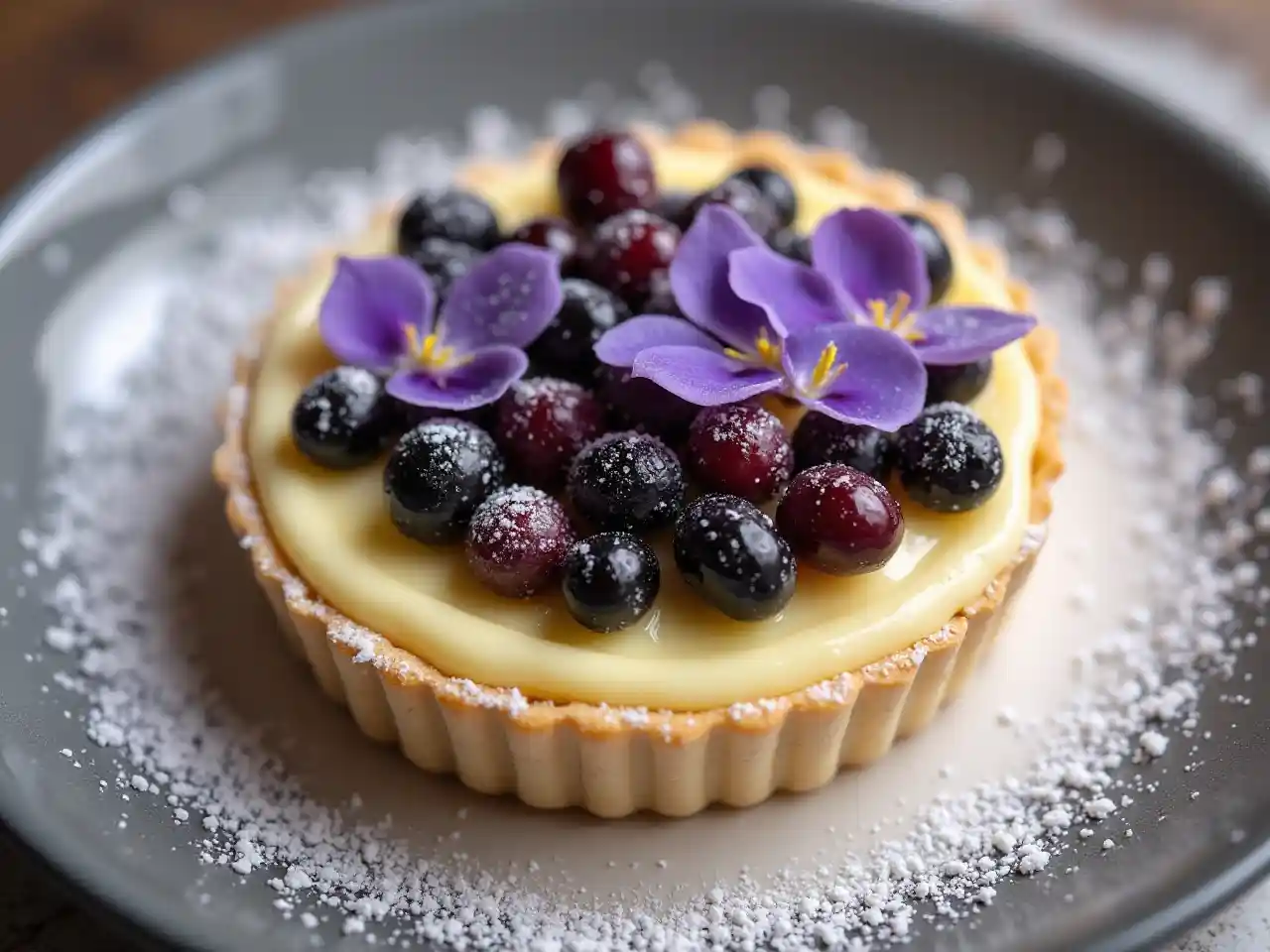 tarti nyepesi ya cream iliyo na mazao ya rangi ya nyeusi na violeti vyenye sukari