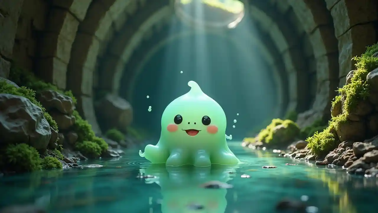 Uumbaji wenye kuvutia, wenye kuvutia, wenye kuvutia, ambao umeketi katika mfumo wa maji machafu, ukitabasamu kwa usafi wa kitoto. Kiumbe huyo ni mdogo na wa mviringo, na mwili wake ni kama gelatin, na unang'aa kwa rangi ya bluu na kijani. Macho yake makubwa yanayong'aa na mdomo wake mdogo unaochanganya humpa sura nzuri. Matone ya matope huanguka kutoka mwilini mwake, na kutokeza mawimbi madogo katika maji yasiyo na kina na machafu. Tovuti hiyo imechorwa kwa njia ya pekee: kuta za mawe zilizofunikwa na mwani, mabomba yaliyotiwa kutu yanayovutia maji, na takataka zilizotawanyika kama vile vigae vilivyovunjika na vipande vya chuma. Nuru nyembamba hutiririka kupitia mashimo yaliyo juu, ikionyesha juu ya uso wenye maji na kutoa mwangaza wa hali ya juu. Licha ya mazingira yenye uchafu, kuwapo kwa kiumbe huyo huongeza hali ya furaha, na kuunda mandhari yenye kuvutia. (Hyperdetailed, surreal, 4k)