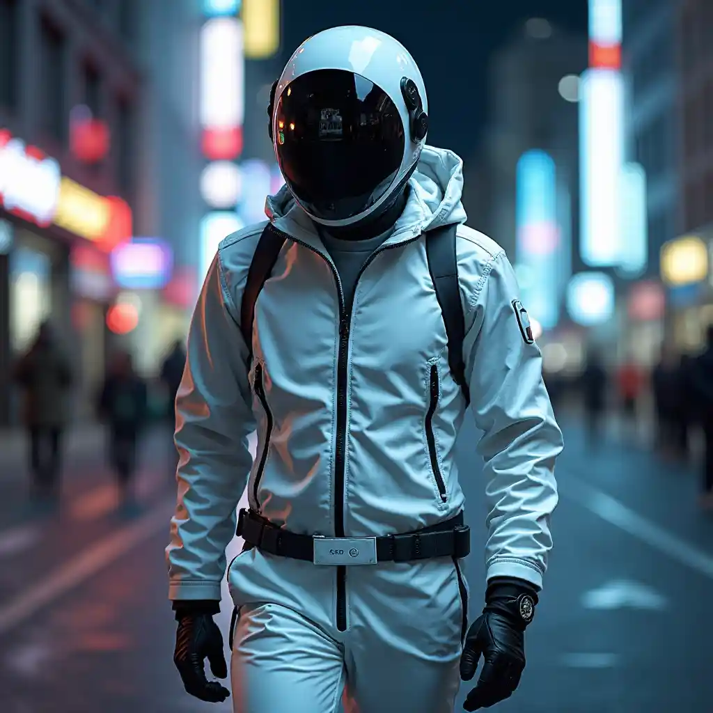 kipande cha sanaa, ubora bora, kina, 8k wallpaper, mbali, mwili kamili, mtu na fantastic cyberhelmet, amevaa nyeupe techwear koti, barabarani, kiuno nyepesi,