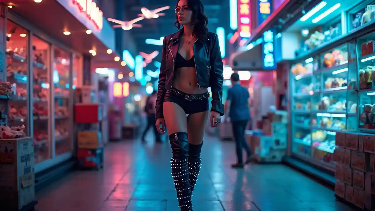 Akijionyesha katika soko la mtandao lenye taa za neon, mwanamke wa Mashariki ya Kati mwenye umri wa miaka 40 na kitu anaonekana akiwa na koti lililopunguzwa na viatu vya juu vya kiuno na vifungo vya LED. Viwanda vyenye mwangaza na ndege zisizo na mwendo humweka katika mazingira yenye msukumo, na miguu yake yenye umbo na kiuno chake kinachotoa nguvu za uasi na ushawishi wa mijini.