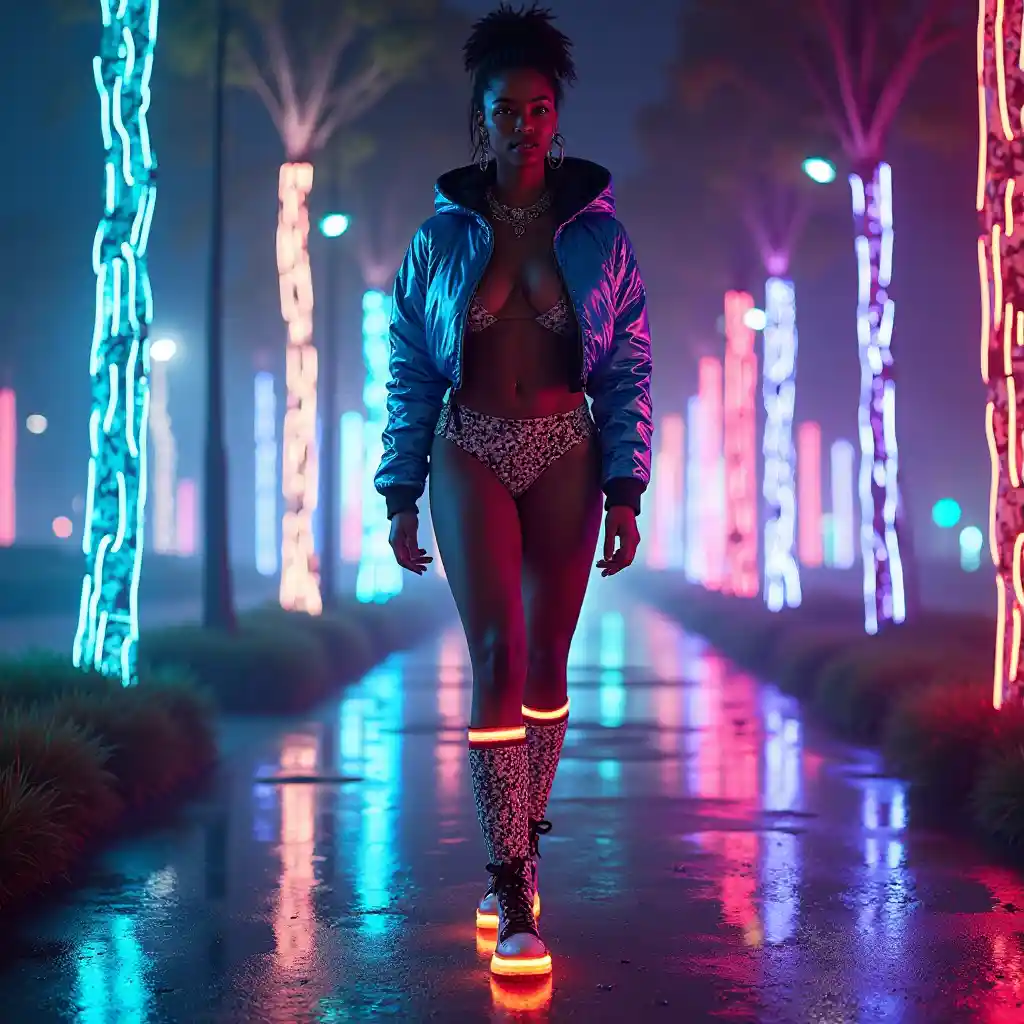 Akienda kwa miguu katika bustani ya mtandao iliyo na taa za neoni, mwanamke mweusi mwenye umri wa miaka 25 anaangaza akiwa na koti na viatu vya juu vya paja na kifaa cha LED. Miti na watu wanaokimbia kwa njia ya hologramu humweka katika mazingira yenye nguvu ya wakati ujao.