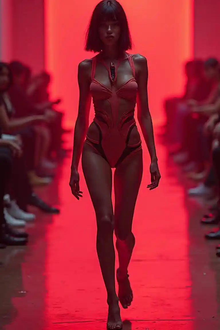 Emerycyberpunk style. Futuristic maonyesho ya mitindo katika 3025, kufuatia runway minimalist. ultra-mshangao, high-tech nguo, mkali, hai mwangaza katika vivuli vya nyekundu, gr