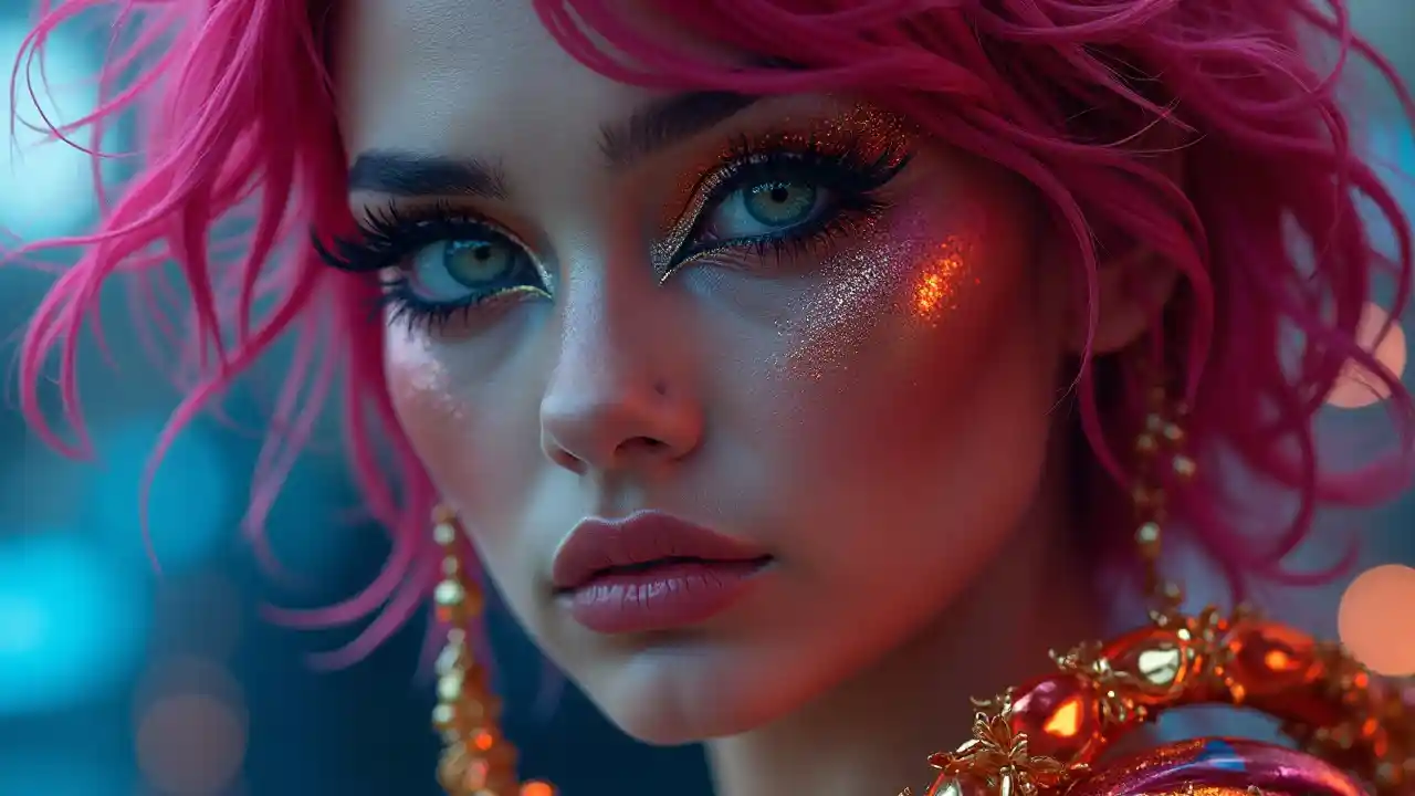 Picha ya hindi zahra rangi mkali na mchanganyiko, kifahari, kina sana, mtindo, gazeti mtindo, focus kali, Bright expressive makeup, Dramatic Lighting, Depth of Field, incredibly high detailed, blurred background cyberpunk style, futuristic