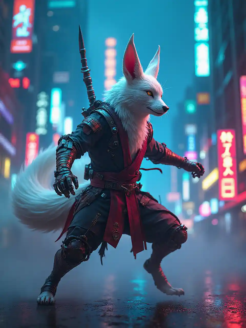 Picha ya kuvutia ya kitune yenye mwili mzima katika hali ya kupigana iliyowekwa katika mji wa cyberpunk, ulioangazwa na taa za neon. Mandhari hiyo ni yenye kusisimua na yenye kupendeza sana, na ina mambo mengi yaliyochorwa kwa uangalifu. Mwangaza wa sinema hutoa vivuli vyenye kuvutia, ambavyo huimarishwa na ukungu wa kiasi na anga yenye mwangaza wa asili. Picha inachukua kiini cha uzoefu wa kina wa sinema, ikikumbusha picha muhimu, na nishati kali na mwendo. Kitsuen, ambayo imepambwa kwa vifaa vya kompyuta, hutumia silaha ya pekee, ikionyesha fahari na wepesi wake. Nyuma kuna mandhari ya jiji yenye kupendeza sana na majengo makubwa ya kujenga, kila moja ikiwa na matangazo ya hologramu. Licha ya mambo yenye kukengeusha, kuna mchanganyiko wenye upatano wa hekaya za kale na teknolojia ya wakati ujao, ikiunda simulizi lenye kuvutia. Picha huhifadhiwa kwa ubora wa juu, ikiepuka mitego ya kawaida ya makosa ya kuona, kuhakikisha uzoefu wa kushangaza na wa kushangaza.