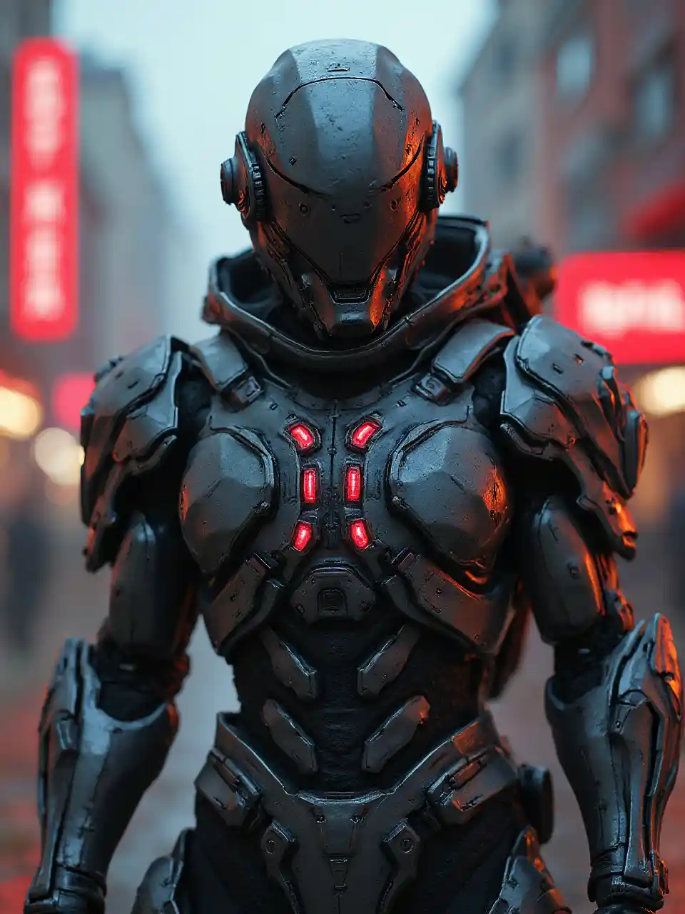 sanaa hyperrealistic Futuristic cyborg na silaha ya juu silaha, na kofia, KINGMONSTER neon nyekundu kwenye background, barabara, overcast, reflection mapping, muundo tata na maelezo, taa ya ajabu, photorealistic, 8k, injini isiyo ya kweli. maelezo ya juu, picha, uhalisi uliosukumwa hadi, texture nzuri, incredibly lifelike