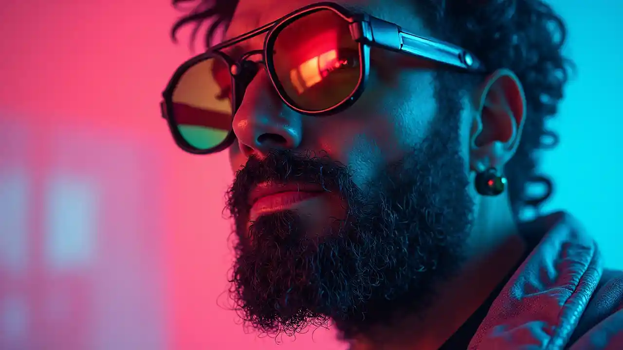 Picha ya punk wa kichaa mwenye ndevu, ultra realism, super detailed, neon colors, magazine cover, professional shot, magazine photography, bright colors, sharp focus, highly detailed