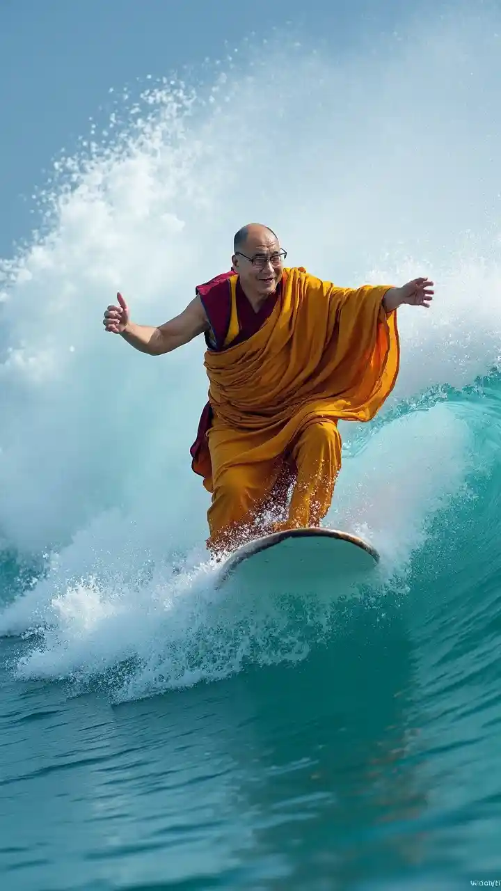 Dalai Lama anapanda wimbi kubwa kwa fahari, mavazi yake ya rangi ya zambarau yakivuma upepo wa bahari anapotazama ubao wa kuteleza, na tabasamu laini katika uso wake, akionyesha amani na upatano katikati ya nguvu za asili.