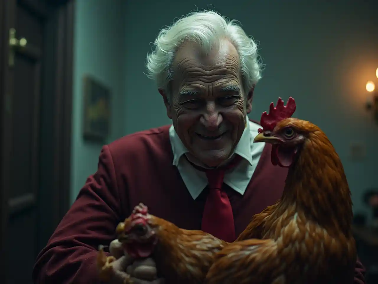 JacobKanali Sanders kama tabia mbaya kuzungukwa na kuku, giza na scary eneo