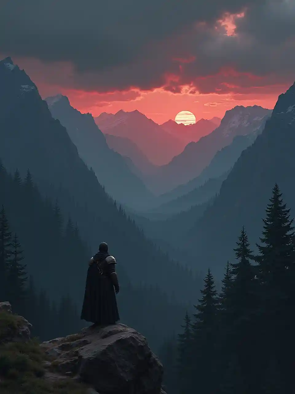 Picha katika mtindo wa ndoto za giza. Askari mwenye mavazi ya kivita ya enzi za kati juu ya bonde. Chini, msitu wenye giza, na milima mirefu nyuma, na kwenye upeo wa macho, anga lenye mawingu meusi na rangi nyekundu.