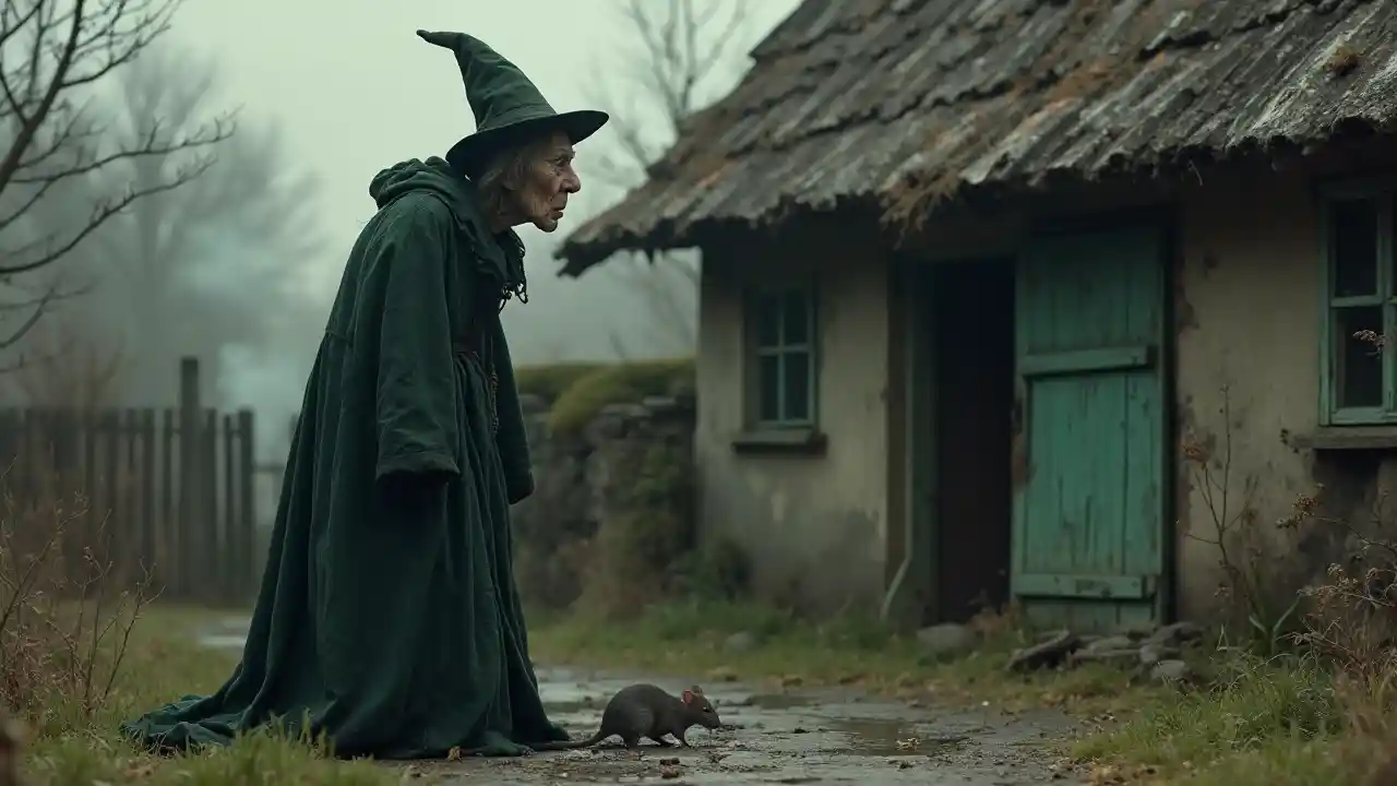 Mchawi mzee amevaa kijani, mbaya na pua kubwa na vidonda, nyuma curved kuonekana kutoka mbele, panya moja ya kijivu kwa miguu yake, amesimama nje ya nyumba. Moshi unatoka kwenye moshi uliovunjika.