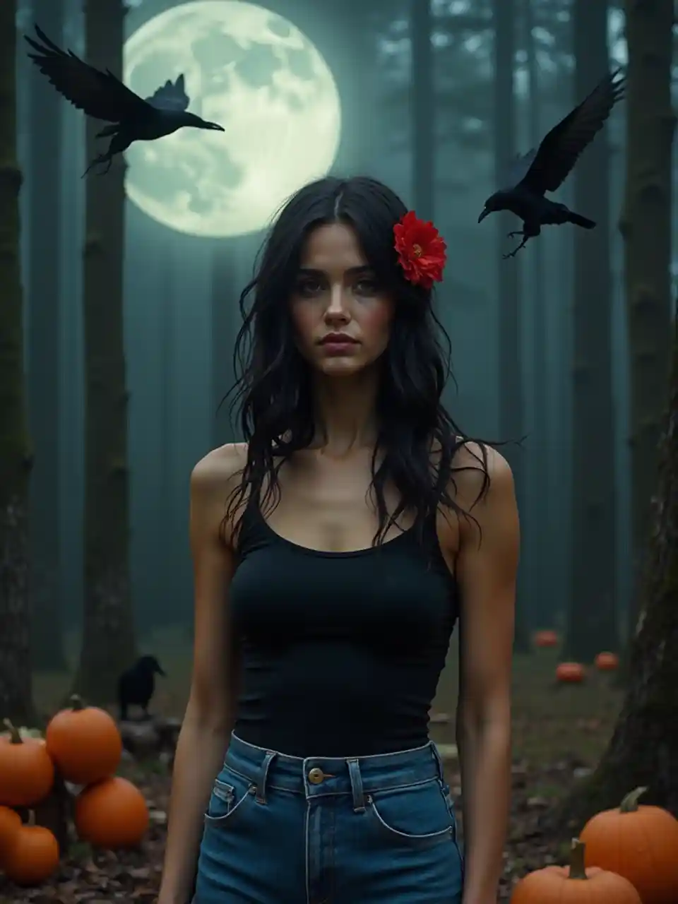JoannaEiza González, Usiku wa Giza, Nyuma msitu, mwezi mkali, siku ya Halloween, kunguru weusi, titi, matikiti, gerbera nyekundu juu ya kichwa upande wa kulia, nyeusi, blue jeans