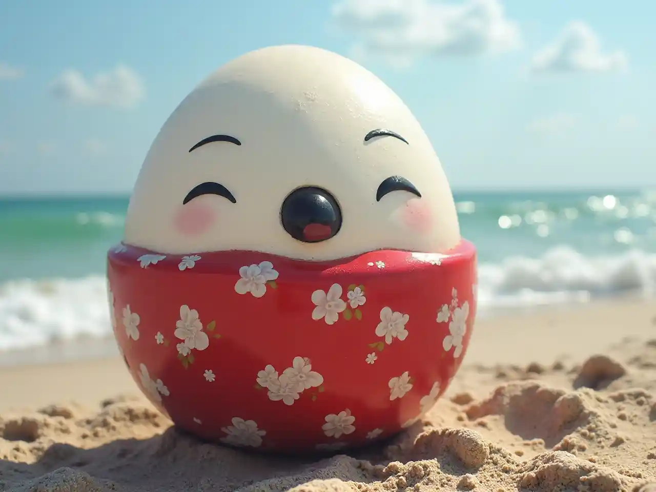 QinxueKijapani furaha daruma takwimu kama yai. Iko kwenye pwani karibu na bahari. Jicho la kushoto ni nyeupe.