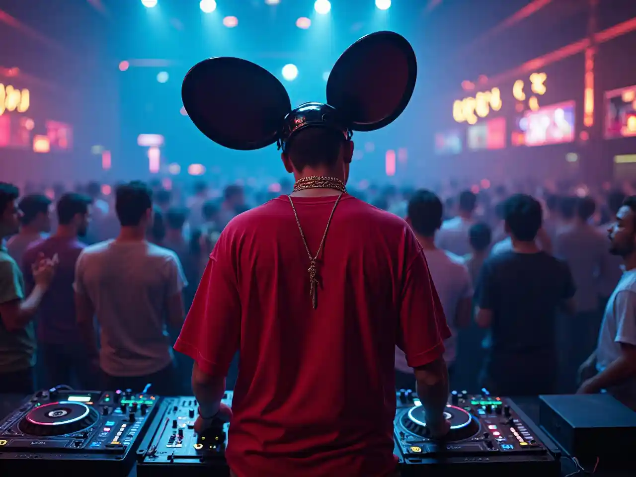 Deadmau5 DJ kucheza katika klabu ya usiku, T-shati nyekundu oversize na mnyororo wa dhahabu, ukumbi kamili ya watu kujifurahisha katika background, ultra realism, super kina, rangi