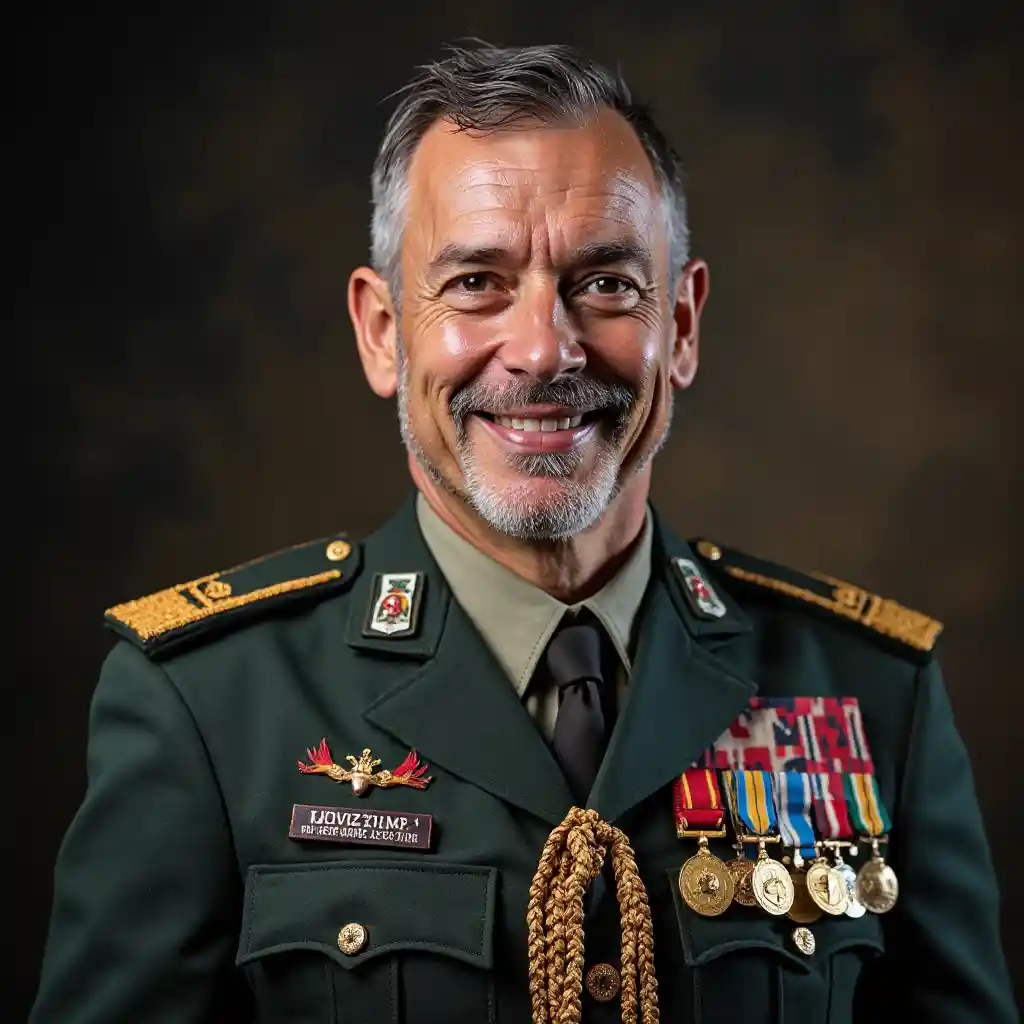 mwanamume aliyevaa sare ya kijeshi, na medali nyingi, akitabasamu