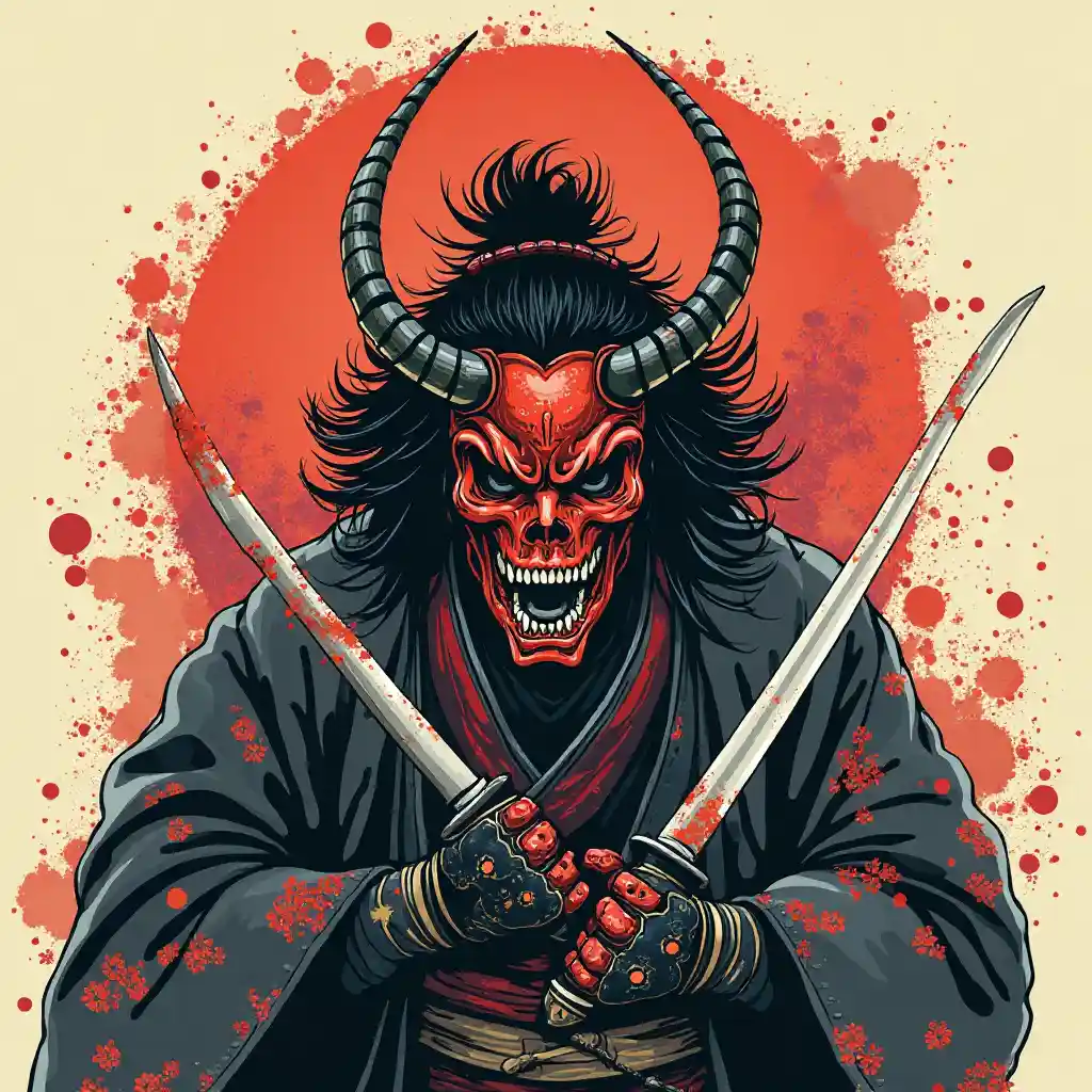 Kielelezo cha pepo mwenye panga mbili na fuvu, mask ya samurai ya pepo, mask ya oni, mwovu aliyevaa mask ya rangi ya nyekundu, samurai mask, samurai na mask ya pepo, samurai ya pepo, shujaa wa samurai, pembe za oni, zilizoongozwa na ryūkōsai jokei, mtindo wa sanaa ya Kijapani, iliyoongozwa na kawana kyōsai, siri