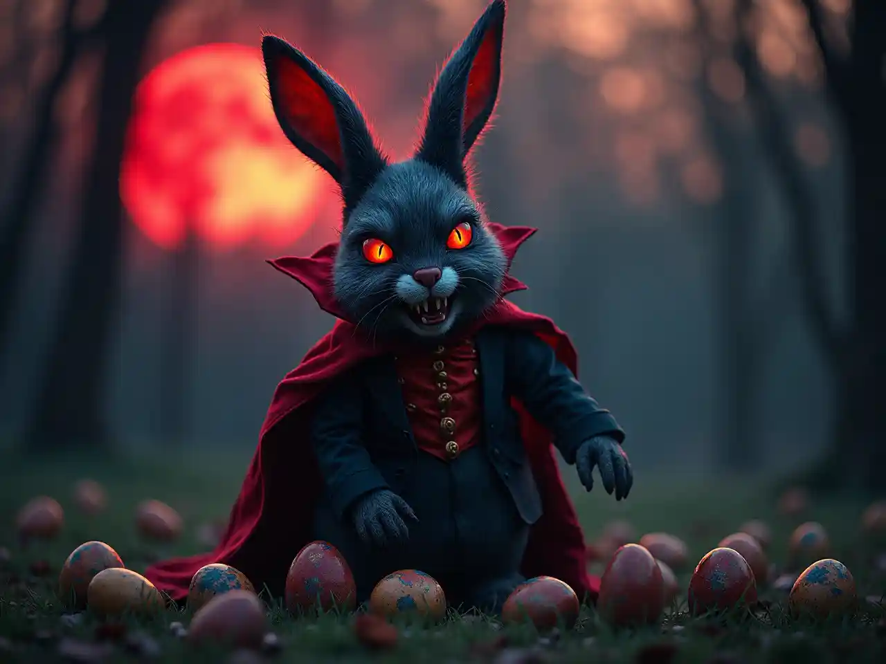 KinsleyDemonic gothic sungura na macho ya damu nyekundu na kuonekana kutisha amevaa mavazi ya vampire kuwinda mayai ya Pasaka usiku mwanga na mwezi nyekundu