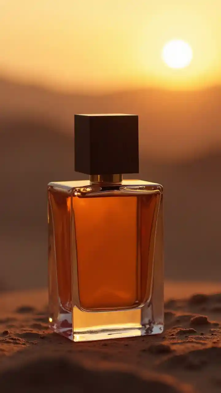 Chupa ya marashi, nyepesi, ya mraba, yenye rangi ya manjano. Ina kofia ya mbao, nyeusi, na ya mraba. Inakaa mahali pasipo na maji, na jua linatokea mbali.