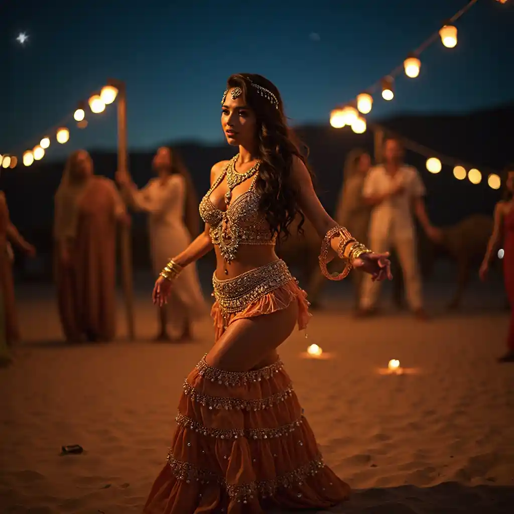 Akicheza dansi katika kambi ya jangwani iliyoangaziwa na taa, mwanamke wa Mashariki ya Kati mwenye umri wa miaka 25 hivi, anaonekana akiwa na mavazi ya dansi ya tumbo. Ngamia na anga lenye nyota humweka katika mazingira mazuri, na mwendo wake wa kawaida hutoa mvuto wa kipagani.