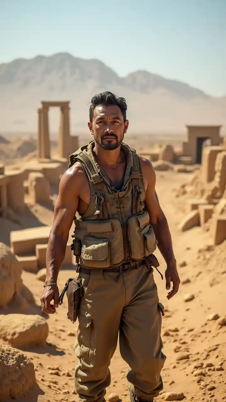 Akiongoza uchimbuaji wa vitu vya kale jangwani, mwanamume wa Asia mwenye umri wa miaka 50 hivi anaangaza akiwa na koti gumu. Mabomoko ya kale na mchanga humweka katika mazingira, uongozi wake thabiti na mikono iliyochakaa ikitoa udadisi wa kiakili na nguvu ya asili katika mandhari ya kihistoria.