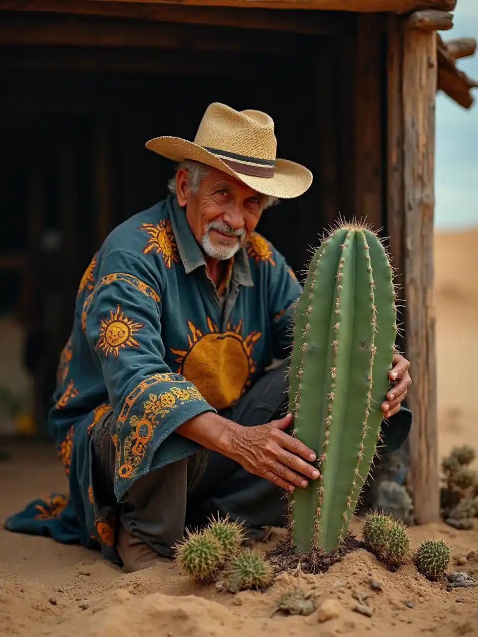 Mwanamume Mzee Akitunza Kaktusi Katika Nyumba ya Jangwa