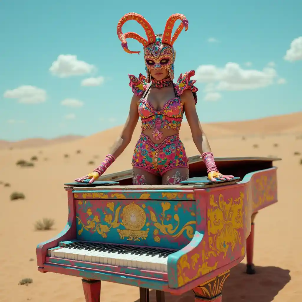 mask ya kike luchador (alivaa full luchador mavazi na mask na maelezo sparkly) katika rangi, sparkly mavazi na mask, amesimama juu ya rangi piano katikati ya jangwa , anga ya ajabu, playful na maisha, ultra-maelezo, HD, surreal na furaha mazingira, kukamata wakati wa kichacha wa playfulness na nostalgia, visually striking tableau.
