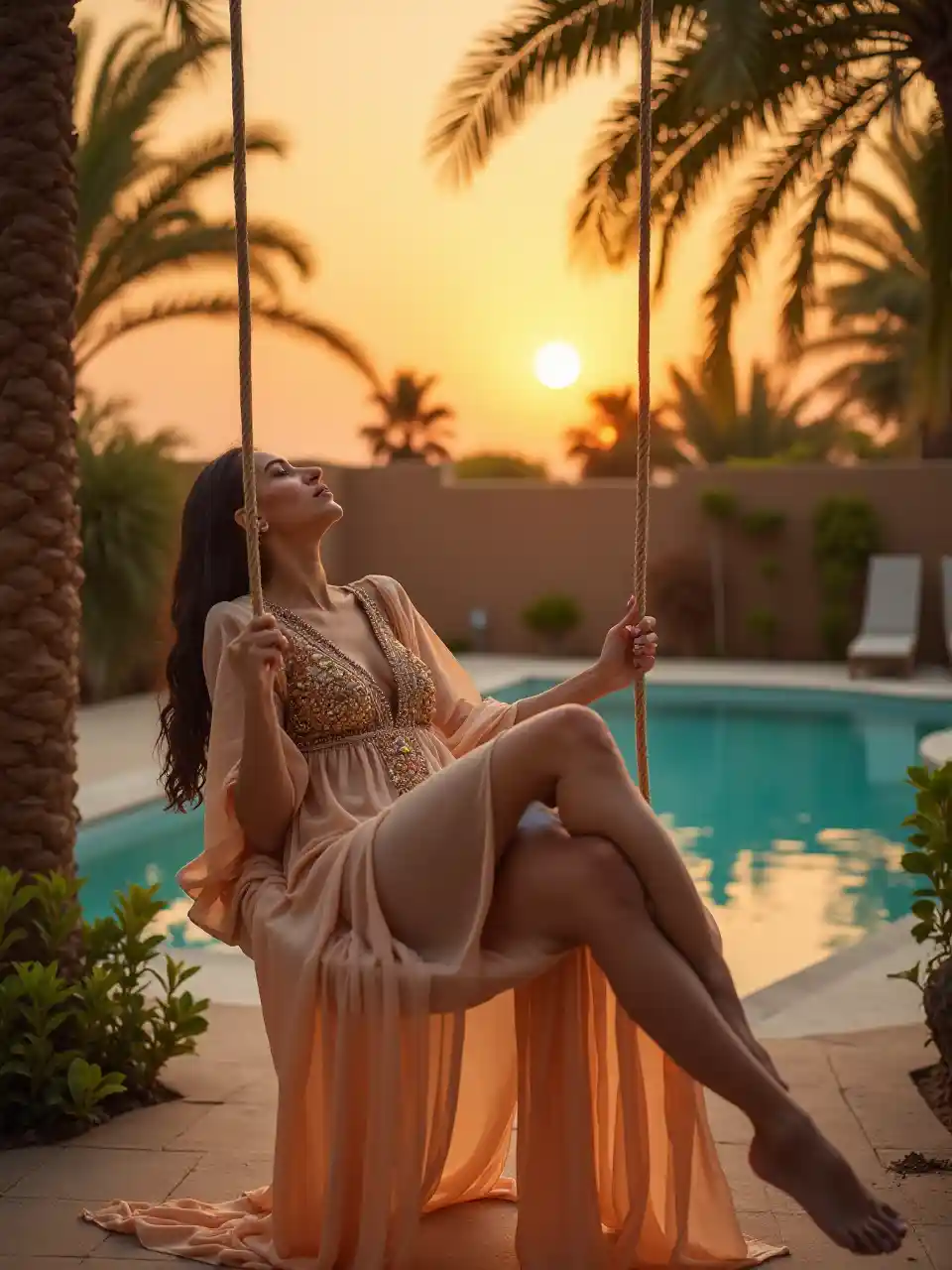 Akiwa amelala kwenye matuta yaliyofunikwa kwa hariri katika eneo la jangwani, mwanamke wa Mashariki ya Kati mwenye umri wa miaka 25 hivi anavutiwa na kaftan yenye vilemba. Mitende inatikisika, dimbwi la rangi ya turquoise linang'aa, na sura yake yenye utulivu chini ya machweo yenye joto huonyesha uzuri wa ajabu.