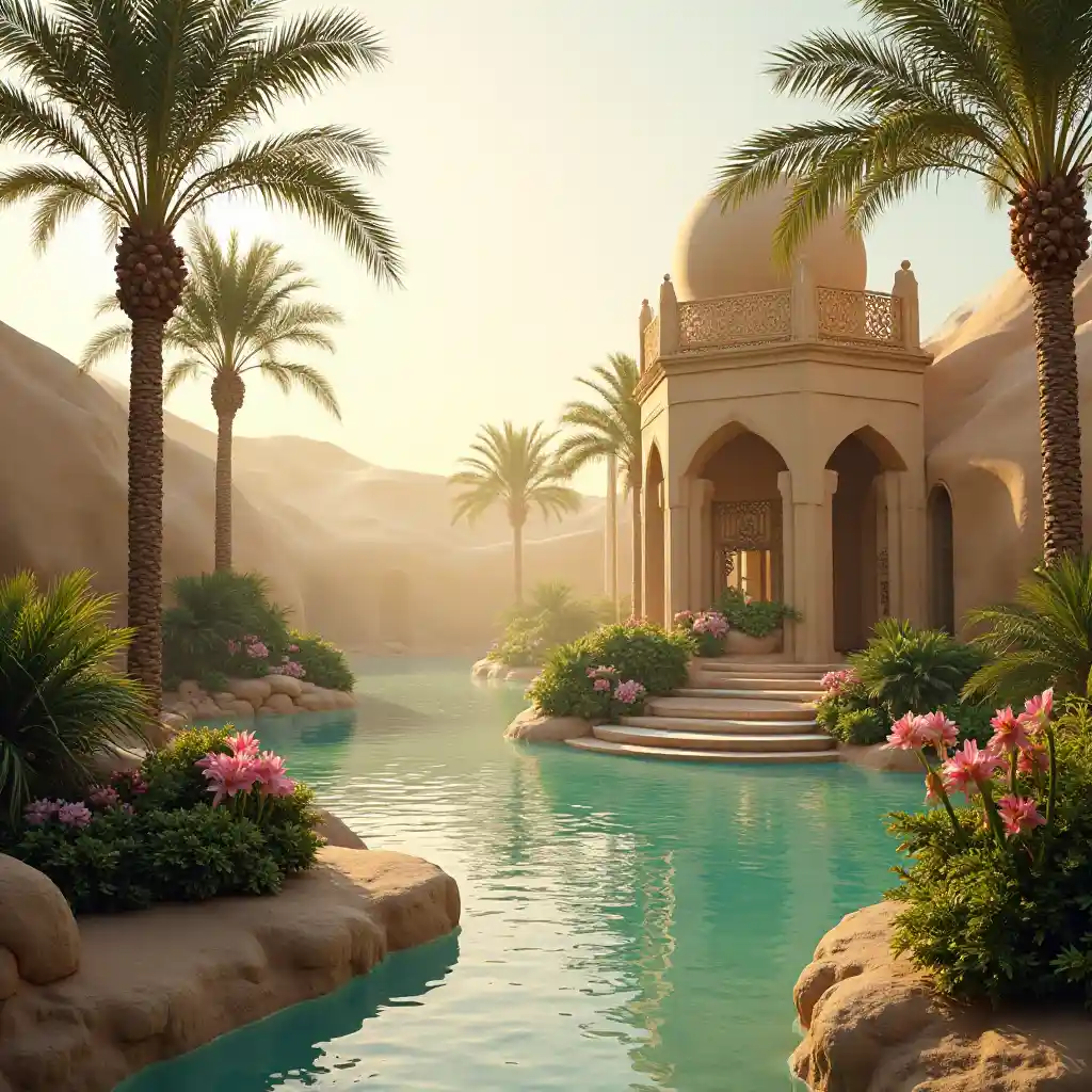 OliviaMamba ya mchanga na oasis na mitende , mimea ya kitropiki na maua , lilies pink , bwawa la turquoise na gazebo ya Arabia . Nuru ya jua ya dhahabu . Ukungu .