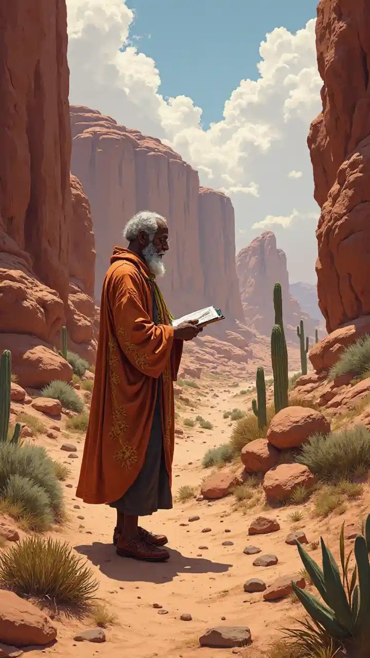 Akieleza kuhusu magofu katika bonde la jangwani, mwanamume mweusi mwenye umri wa miaka 77 mwenye ndevu nyeusi amevaa vazi lenye rangi ya jua. Mawe mekundu na miani ya kaktusi humweka katika mandhari yenye kuvutia, na miisho yake yenye usahihi hutoa habari zenye kuvutia na ajabu ya kihistoria. Sanaa yake huonyesha hadithi zilizosahaulika.
