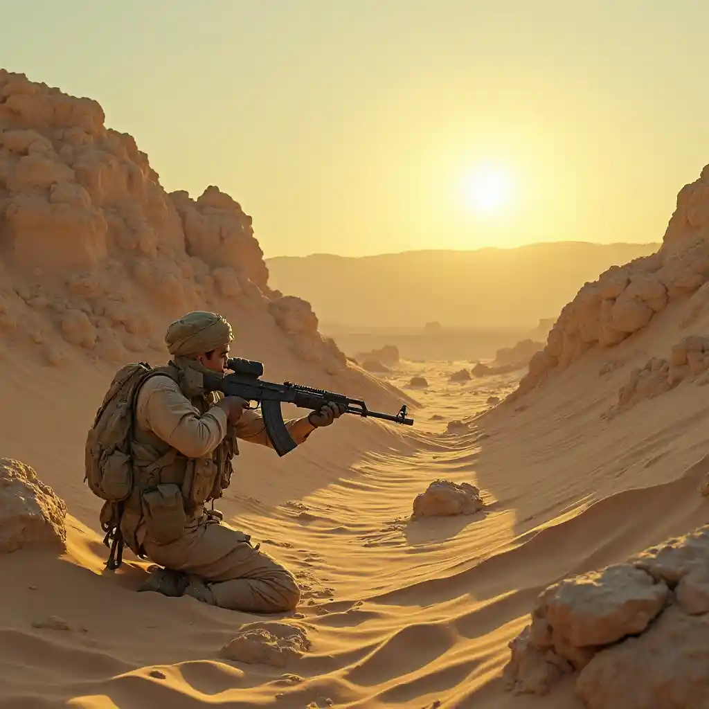 The desert was too beautiful for war. The early sun poured gold over the endless sands of Syria, casting long shadows from the broken stones and rusted remnants of a life once lived in peace. The wind moved softly — as if mourning — sweeping through valleys of dust and bone, whispering lullabies to the dead. From a distance, it looked like a painting: A quiet land breathing in stillness, unaware of the violence it cradled. But beauty is a cruel disguise. Without warning, the silence shattered. A sharp crack tore through the air — then another, and another. Gunfire. Too close. Amir dropped to the ground instinctively, the sand hot against his skin. His fingers curled around his AK-47 as muscle memory took over. He didn't think. He reacted. Screams followed — short, guttural, silenced by bullets. His unit was ambushed. Somewhere from the northern ridge — a sniper, or worse, an encirclement. “MOVE!” one of the voices yelled, but the direction was lost in the chaos.