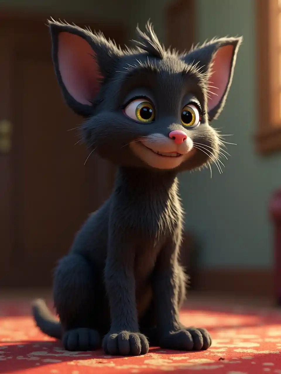 Poster ya filamu katika mtindo wa Disney Pixar paka mweusi na kifua nyeupe na nywele nyeupe na macho ya