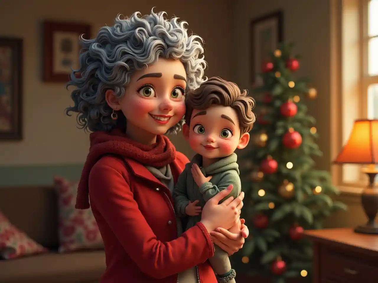mwanamke, umri wa miaka 70 na nywele curly kushikilia mtoto wa kiume, Disney Pixar Krismasi style