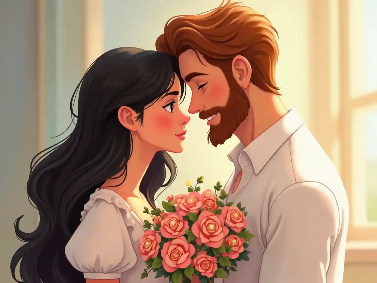 Wanandoa vijana wazuri: mwanamke mwenye nywele ndefu nyeusi na mavazi meupe yenye mikono, akibeba bouquet, akigusa kipaji chake kwa mtu mwenye nywele za kahawia na ndevu aliyevaa shati nyeupe. Disney Pixar Style
