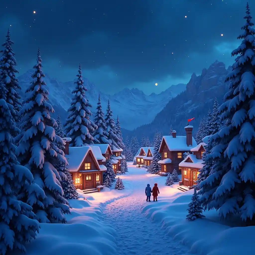 MichaelNight mtazamo wa kijiji kichawi, theluji katika mtindo Disney Pixar, ultra-kweli.