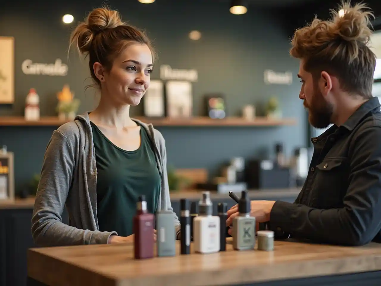 Nathanmwanamke amesimama kwenye kaunta ya maduka ya dawa na budtender kusaidia kuonyesha bidhaa zake tofauti