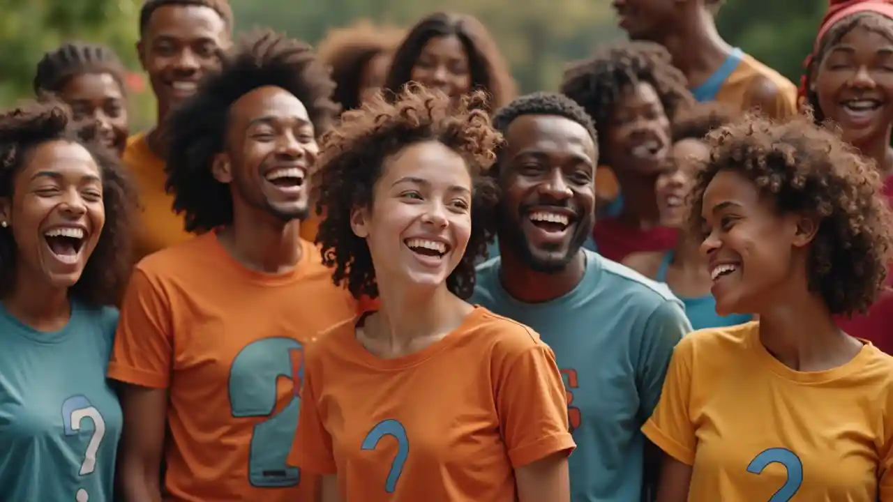 (watu mbalimbali na "?" juu ya mashati yao), aina ya mavazi, rangi ya kupendeza, hisia za furaha, vivuli vinavyopakana, muundo wa nguvu, mkutano wa kawaida, hali ya joto na ya kukaribisha, ubora wa juu, azimio la 4K, mazingira ya kina, taa la kuonyesha kundi tofauti, akisisisi kuingizwa na udadisi.