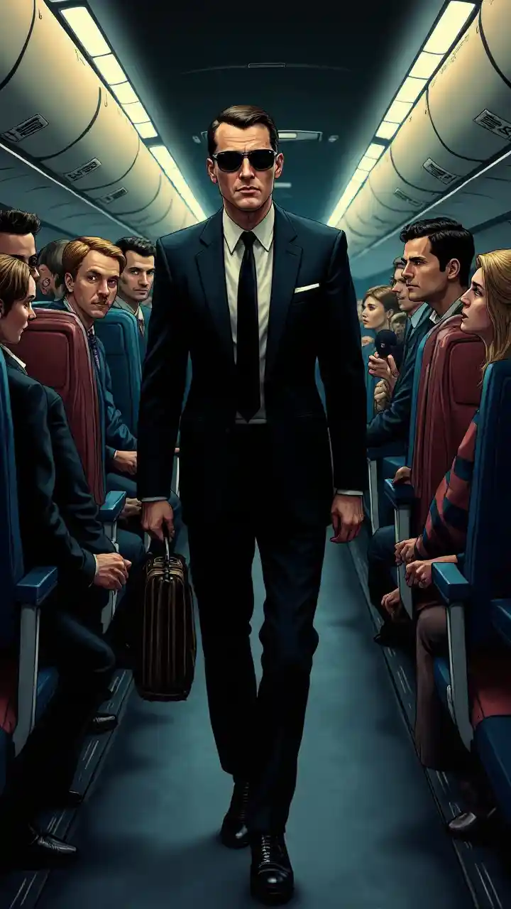 Unda picha ya kuchekesha inayoonyesha D.B. Cooper, mtu wa ajabu aliyevaa suti nyeusi na miwani, akipanda ndege ya Northwest Orient 305. Sehemu hiyo inapaswa kuonyesha Cooper akitembea kwa utulivu kwenye njia ya ndege, na abiria wakimtazama kwa udadisi. Mazingira yanapaswa kutia ndani sehemu ya ndani ya ndege iliyo na mwangaza mdogo, ikionyesha kwamba Cooper ni mtu wa ajabu. Muundo huo unapaswa kuamsha hisia ya ujanja na wasiwasi, kukamata mwanzo wa wizi wake wa kihistoria.