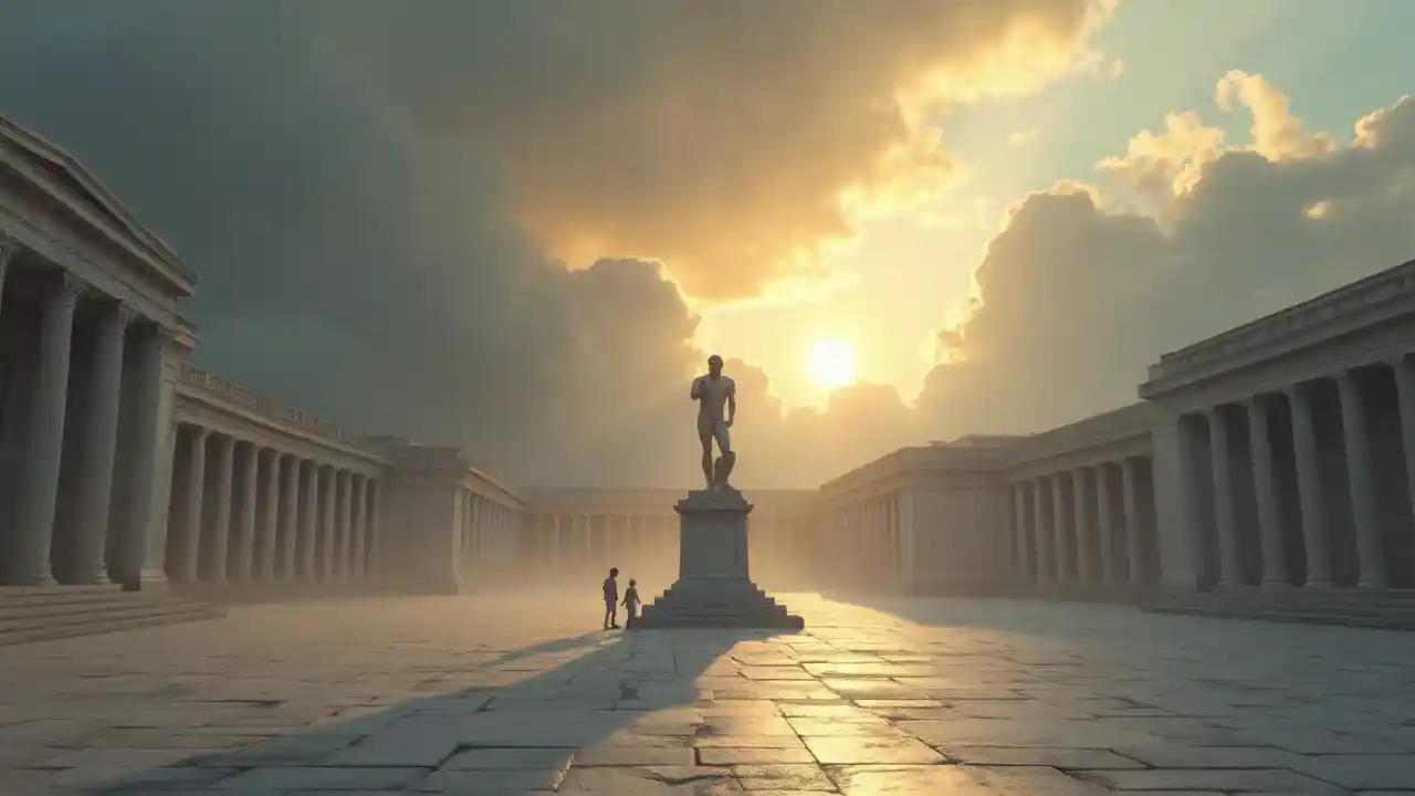 A dreamlike deserted sci-fi urban square starkly lit with long shadows that suggests late afternoon . The light source is low and strong casting elongated shadows from the buildings , statue and figures across the ground. At the center stands a Greek thinker statue. The statue is elevated on a pedestal and casts a dominating shadow that stretches toward the lower left corner. White sci-fi buildings are flanking the square Two small human figures dressed in white sci-fi clothes stand together to the left of the statue facing each other. Their presence emphasizes the vast emptiness of the square and adds a sense of isolation or mystery. The entire scene is steeped in a surreal, mysterious stillness where time seems frozen. The empty square , long shadows and unusual color contrasts create an enigmatic almost dreamlike tension. Mist. Despite the classical architecture the scene feels oddly depopulated and filled with existential unease. The most striking element is the sky . Thick, billowing clouds stretch across the sky, heavy and textured with tones of grey, brown, and hints of blue. These clouds seem to part just enough to reveal a glowing band of soft, golden-yellow light near the horizon, suggesting either a sunrise or a sunset. This light gently spills across the landscape, casting a muted radiance that enhances the depth and mystery of the scene. The style of 19th-century realism.