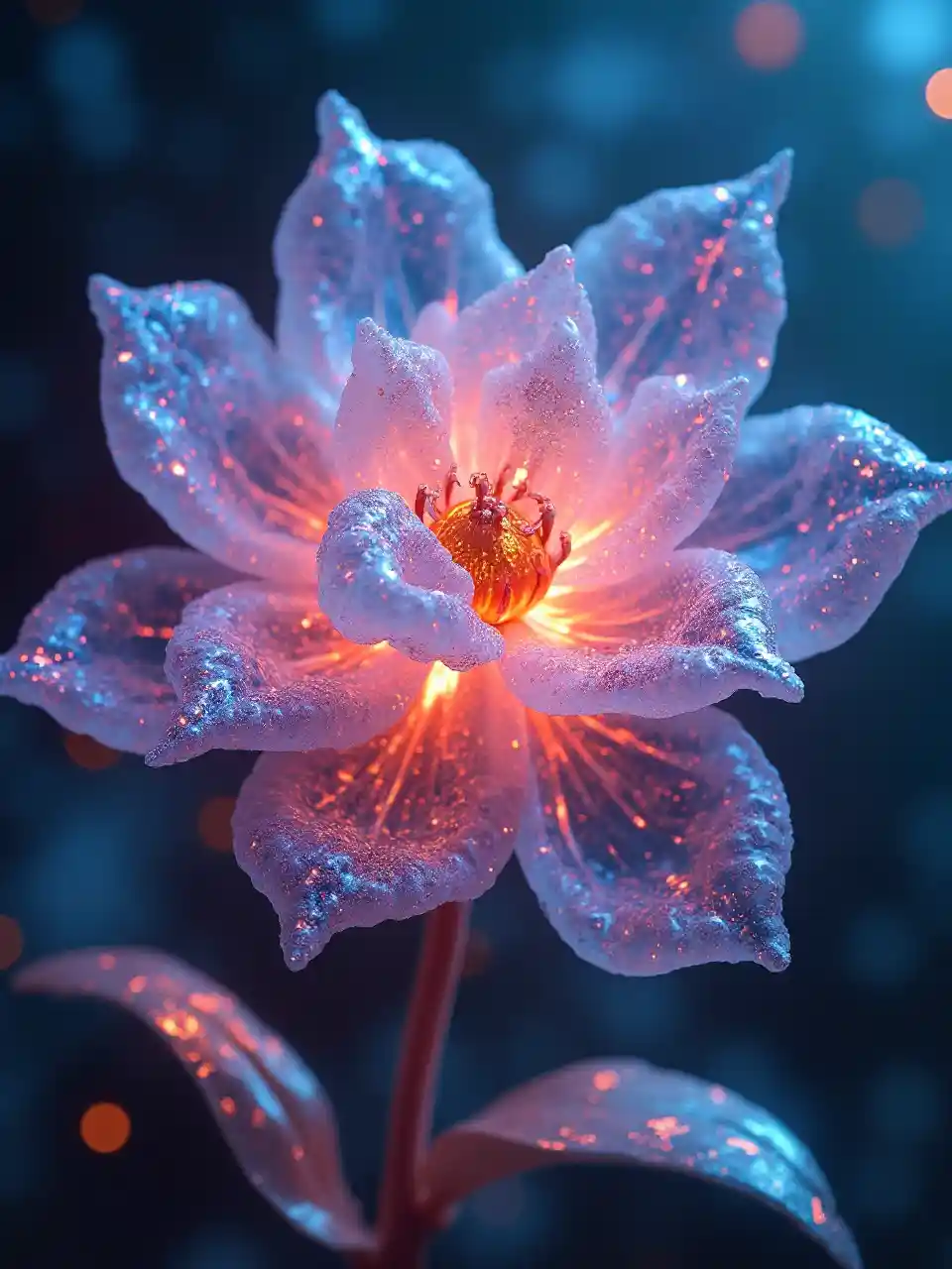 Mtandao wa neva umetengeneza muundo wa kuvutia unaofanana na ua la kioo ambalo hubadilisha rangi kulingana na pembe ya kuona, na maelezo ya juu na taa ngumu ya bioluminescent na athari za UHD. Maua yana kasoro ndogo za umbo kama vile tafsiri za kisanii; vipele vyake vinafanana na iris na wanafunzi waliobadilishwa kwa urahisi, na hivyo kutoa uzuri wa ajabu. Nyuso za kipekee huonekana kama zilizotengenezwa kwa njia ya mfano, na kubadili kwa njia ya hila muundo wa nyuso, huku mambo madogo-madogo yakidokeza mikono ya kigeni yenye mabadiliko ya vidole, na hivyo kuunda hisia za kuvutia. Picha ni makini crafted kuondoa vikengeusha kama vile azimio chini, maandishi overlays, jpeg vitu, au aina yoyote ya watermark, na ni kuepuka masuala ya kukata au sehemu. Hakuna marejeo ya vitambulisho vya nje kama vile majina ya wasanii, alama za biashara, au majina, kuhifadhi kiini chake cha siri na ethereal. Ubunifu huo unaonyesha mawazo ya watu ambao hawapendi kuonyeshwa picha, na hivyo kuwapa watazamaji fursa ya kufurahia mambo ya pekee.