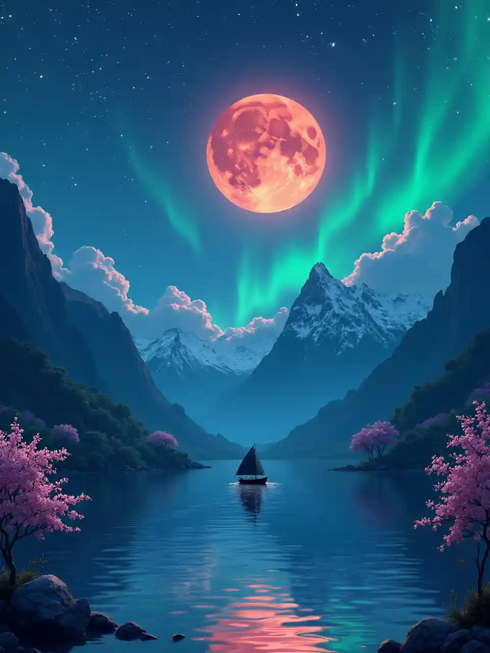 mandhari ya kina sana, Studio Ghibli style, ziwa la utulivu kati ya milima ya kifahari, mashua nyeusi ya kuvutia ambayo inazunguka katikati, silhouette nyeusi dhidi ya mazingira, mwezi mkubwa mwekundu unaangaza kwa upole, nyota zenye kung'aa ziko katika anga la usiku, aurora borealis inayoangaza eneo hilo na majani ya kijani na ya zambara, miti ya sakura yenye majani yanayoanguka ambayo huongeza hali ya ndoto, ikitoa utu na uzuri wa ajabu, 4K, ultra-detailed.
