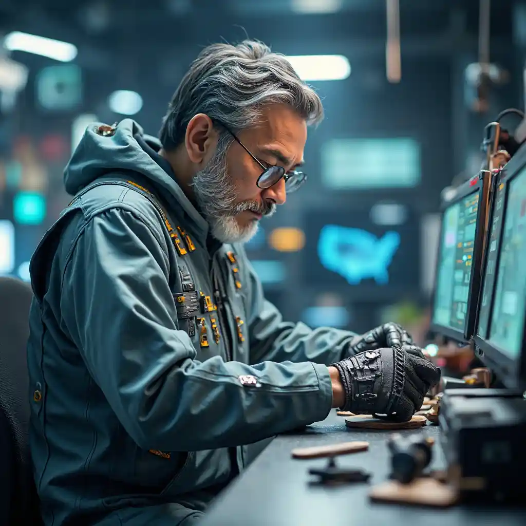Akirekebisha ndege isiyo na rubani katika maabara ya wakati ujao, mwanamume wa Asia mwenye ndevu mwenye umri wa miaka 73 anavaa suti ya kawaida iliyo na viambatisho vya mfumo wa jua. Skrini za hologramu na roboti zinazonguruma humweka katika mazingira ya hali ya juu. Mikono yake itafanyiza kesho.