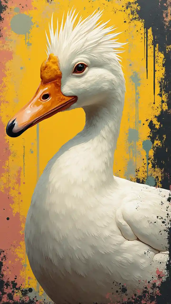 Picha ya kina sana ya bata nyeupe, na Atey Ghailan, na Greg Rutkowski, na Greg Tocchini, na James Gilleard, na Joe Fenton, na Kaethe Butcher, rangi ya rangi ya manjano, nyeusi, na magenta, uzuri wa grunge! graffiti tag ukuta background