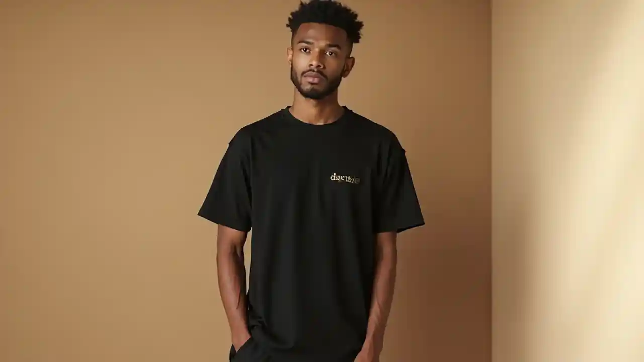 mtindo amesimama katika chumba tupu na beige rangi ya nyuma ya ukuta amevaa oversized nyeusi T-shati na "duende" jina alama juu ya kifua chake cha kushoto katika fonti ya kifahari kama yeye ni kukuza