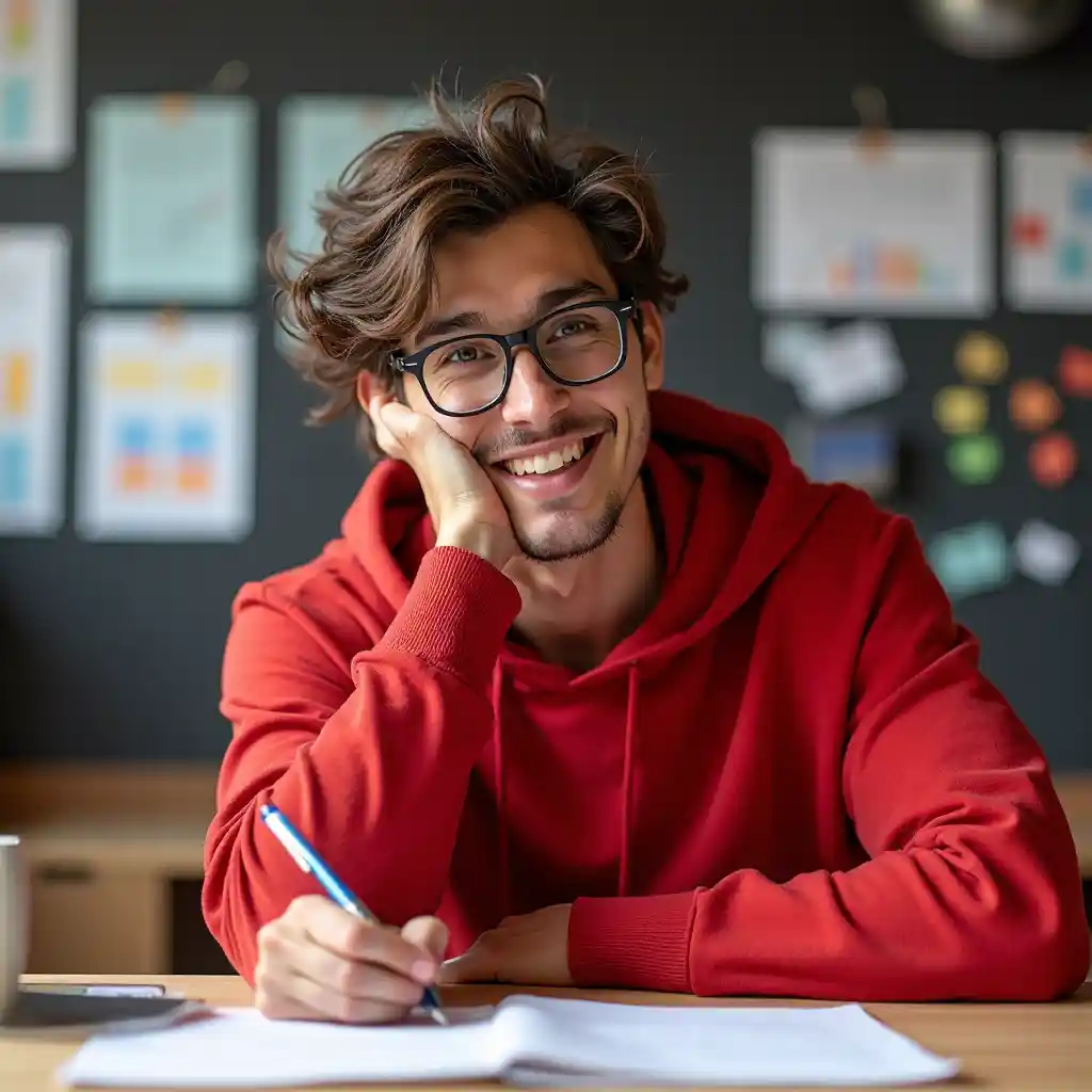 Katika ofisi ya kisasa, kijana mwenye nywele zenye kutikisika hutoa shauku na uchangamfu akiwa ameketi kwenye dawati, akiwa amevaa koti nyekundu. Vioo vyake vyenye rangi nyeusi vinaongeza tabasamu yake yenye kung'aa, ambayo huangaza shangwe anapegemea shavu lake kwa mkono mmoja na kwa mkono mwingine ana kalamu iliyo juu ya karatasi iliyojaa maelezo. Nyuma yake, chati na hati zenye rangi nyingi zimewekwa kwenye ubao mweusi, na hilo linaonyesha kwamba kazi hiyo inafanywa kwa utaratibu na kwa bidii. Mwangaza wa polepole unaongeza hali ya kupendeza, na hivyo kumfanya awe na uwezo wa kufanya mambo kwa njia ya ubunifu. Mandhari hiyo inaonyesha kwamba ana shauku na bidii ya kufanya kazi yake, na hivyo kuonyesha kwamba ana sifa za kufanya kazi vizuri.