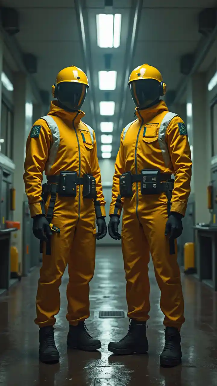 ElijahUtamaduni 6 sanaa mtindo wa Star Wars themed wafanyakazi wawili wa kampuni amevaa retro njano jumpsuit na mechi full uso ko katika ofisi brutal bureaucrati dimly