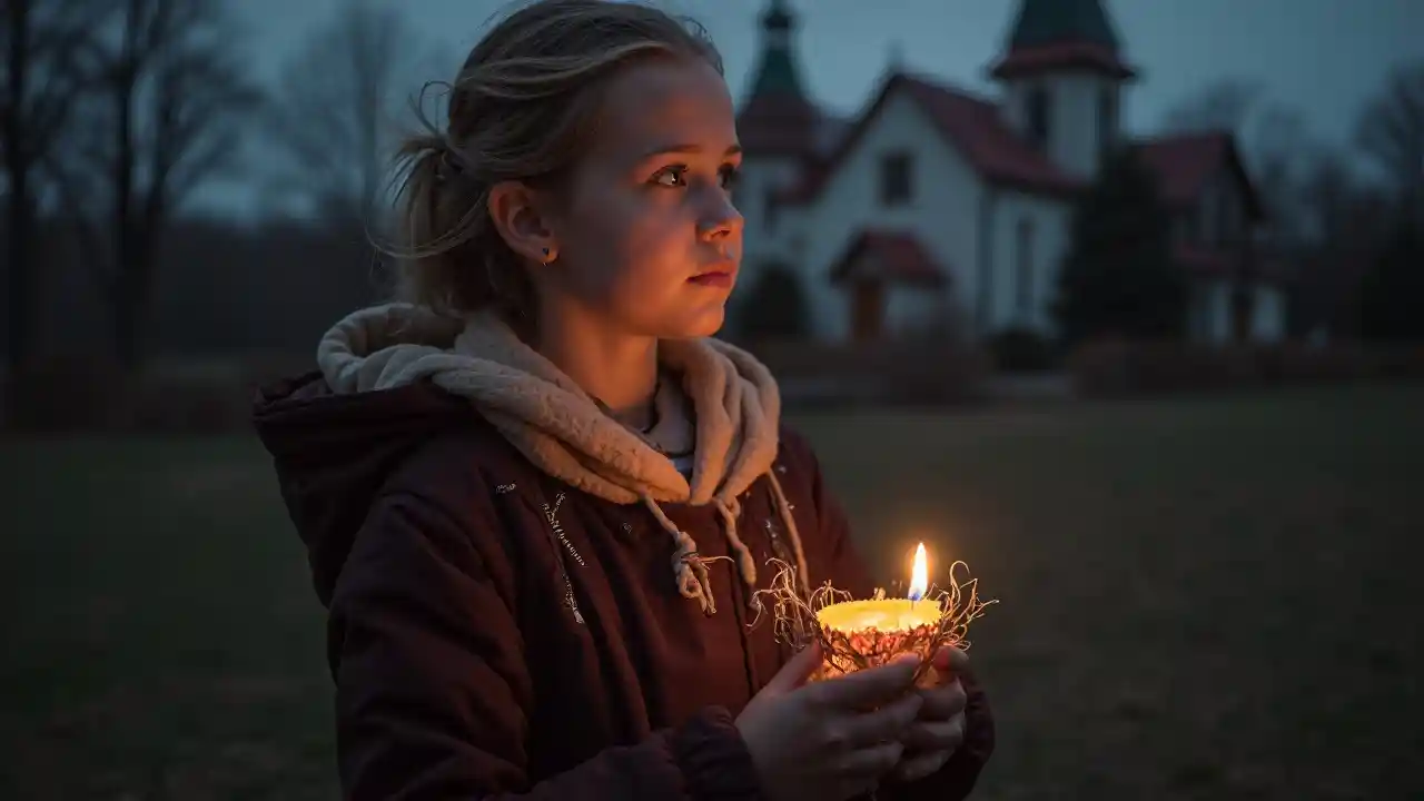 Ista ya Othodoksi, msichana akishika mshumaa nje ya kanisa, usiku