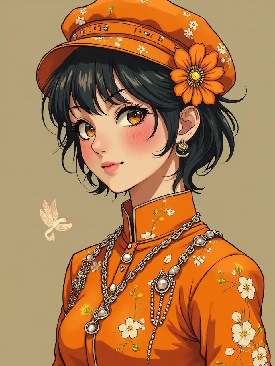 TinaGirl in eco friendly haute couture outfit in the style of anime, surrealism, akira style. details. fine jewelry. eco friendly. orange vibe.