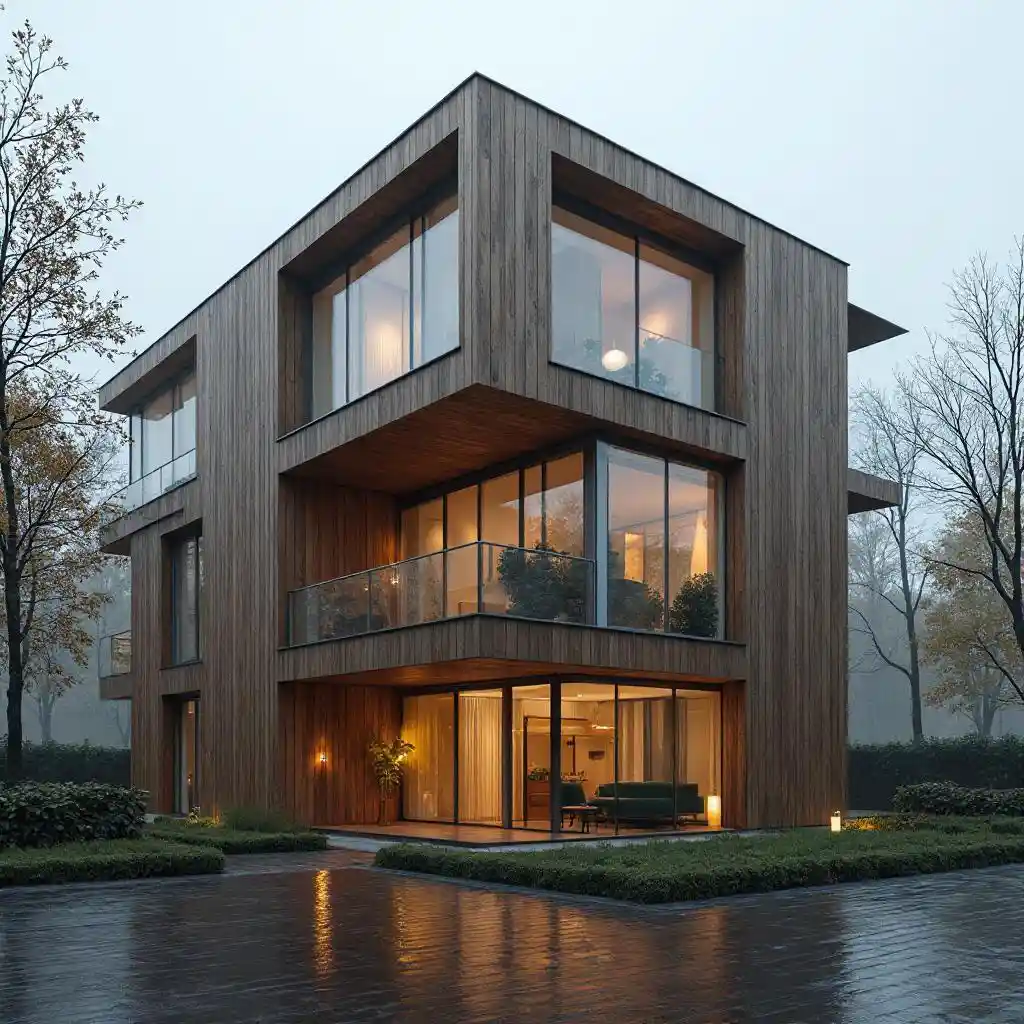 modern 4-storey office building in ecological style with large windows and stele and wood panelling , rainy day