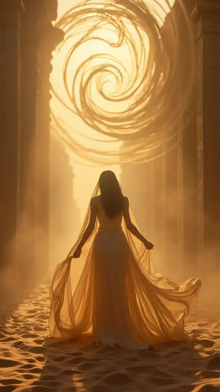 Mzunguko wa mchanga unaotokeza binti mfalme wa Misri aliyevaa nguo za kifahari katika mazingira yaliyojaa magofu ya Misri . Ukungu . Nuru ya jua ya dhahabu
