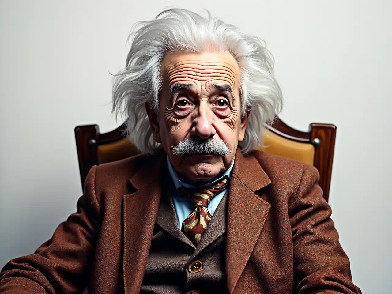 picha ya Albert Einstein, akiwa amevaa nguo ya kifahari, na maandishi, Louis Vuitton, rangi mkali, yenye kina, yenye nguvu, yenye kueleweka, yenye kueleweka, yenye kueleweka, yenye kueleweka, yenye kina, yenye kueleweka, kwenye mandhari nyeupe