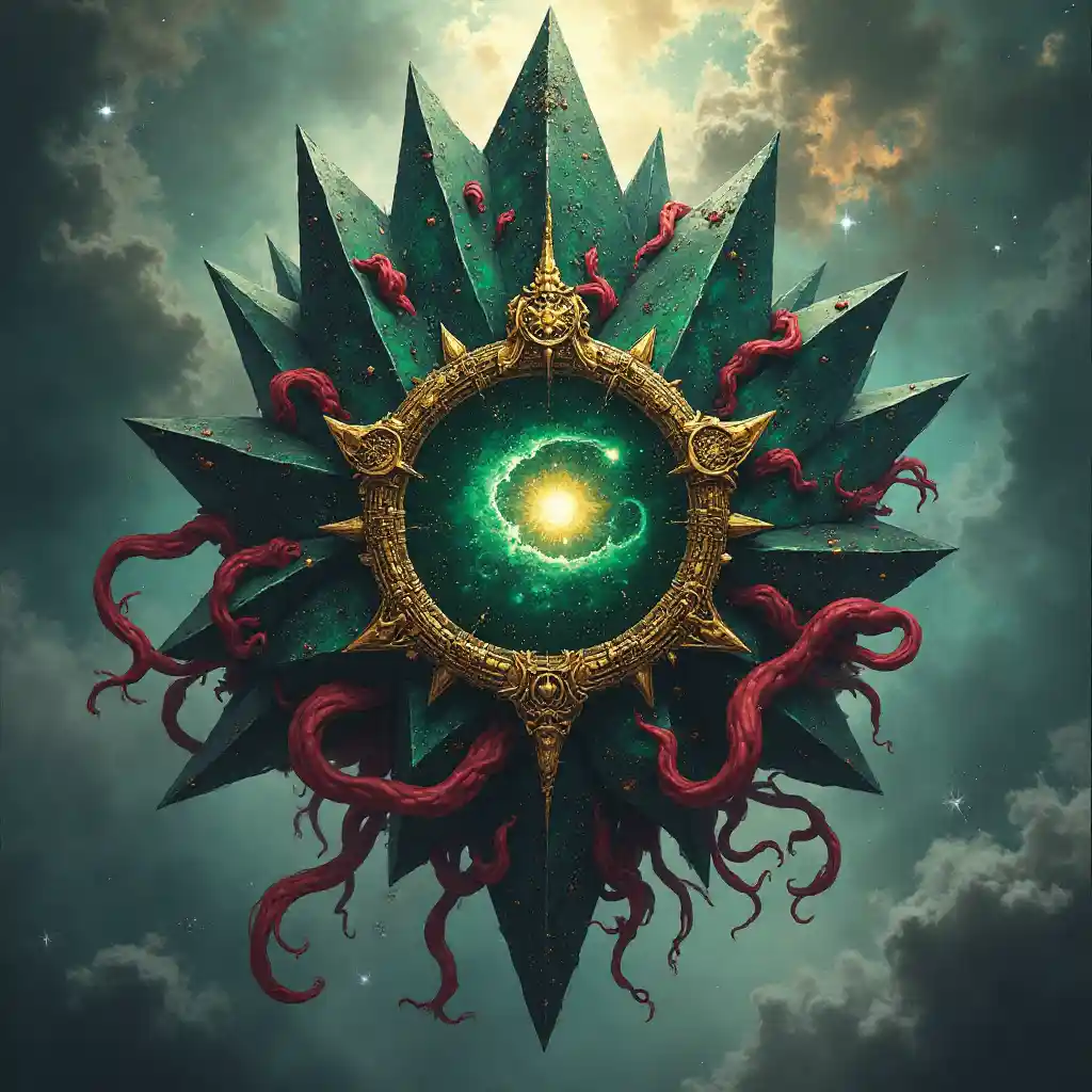 Chora abstract asymmetrical wingi wa viboko obsidian kioo prisms kufunikwa na sigils na glyphs na milango ndogo kuonyesha nyota na nyama nyekundu na tendon na portal kubwa katika wingi na viboko obsidian kufunikwa na mifumo ya dhahabu karibu na kuonyesha kubwa swirling kijani, na tendon vipande na vipande vya obsidian kufunikwa na viboko dhahabu. Piga picha yake ikielea angani juu ya nebula nyeupe, uwepo wake tu unapaswa kugeuka na kupasua nafasi. Hisia ya kipande lazima iwe haiwezekani eldritch hofu ya kimungu, lakini amani. Chora katika hyper-maelezo ya nusu ya kweli 2D kuchora sanaa style.